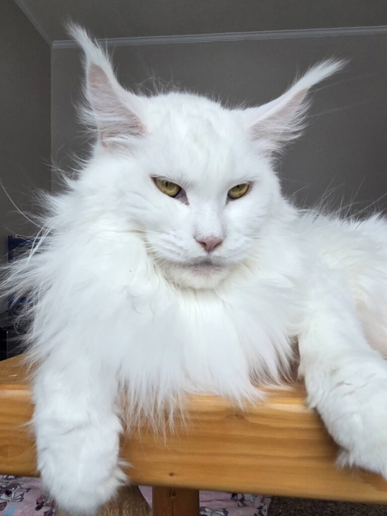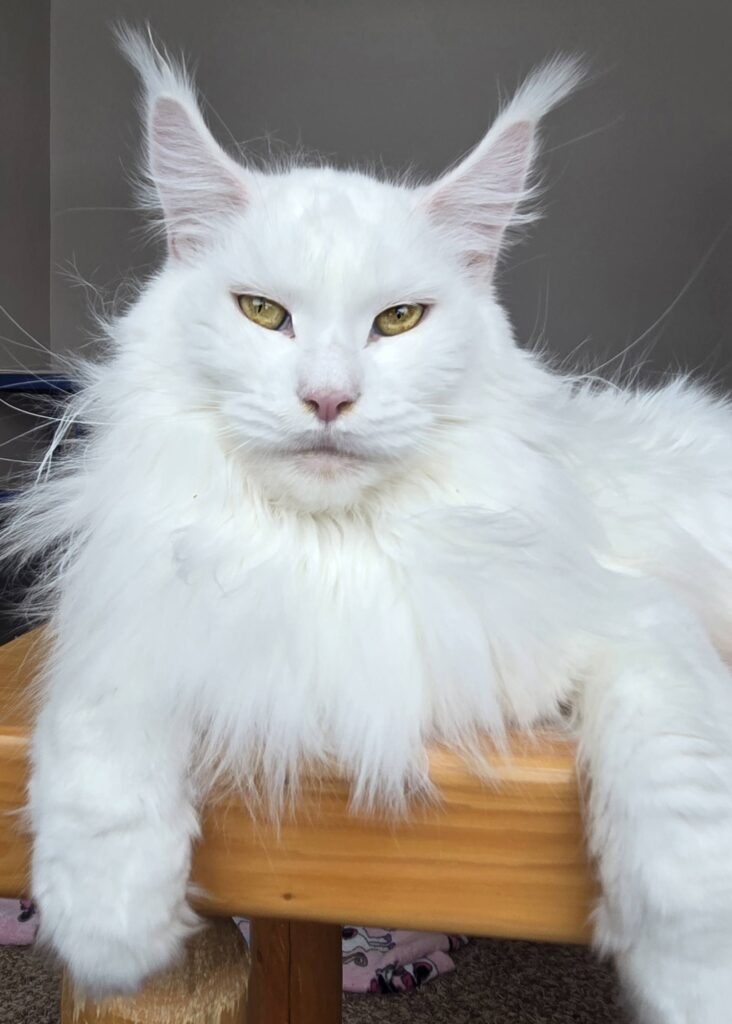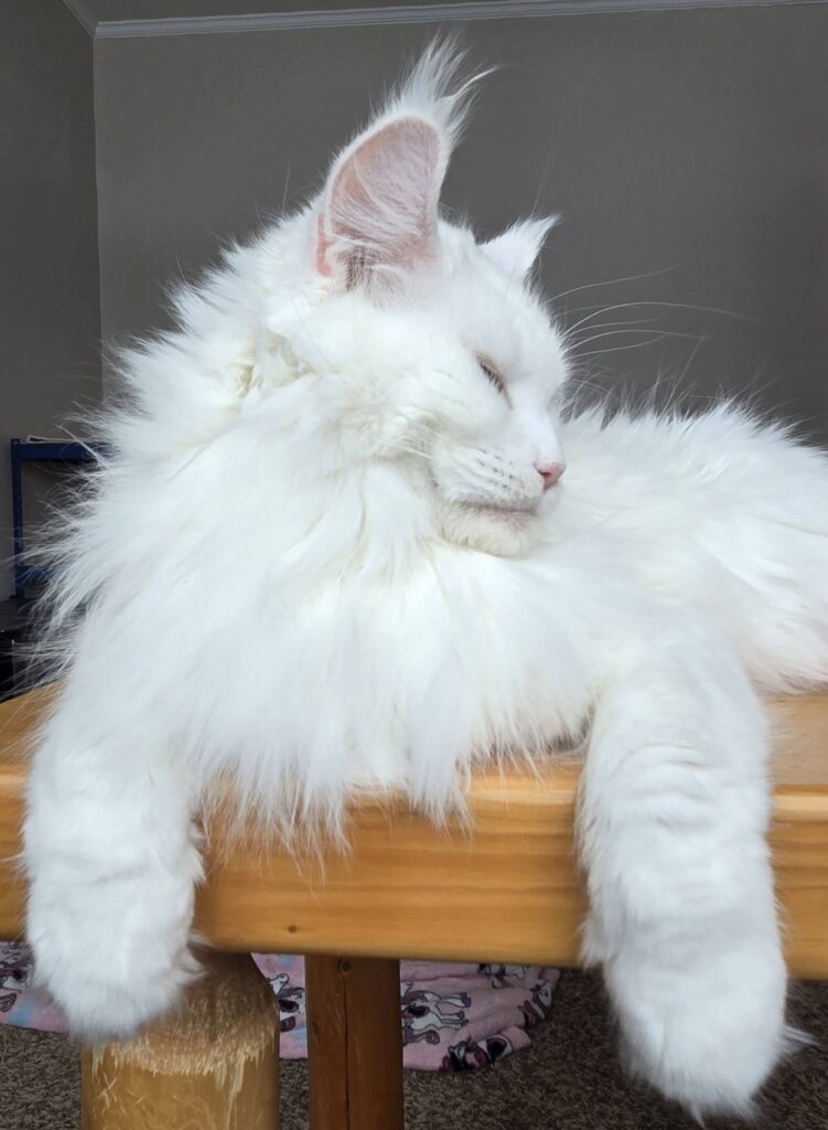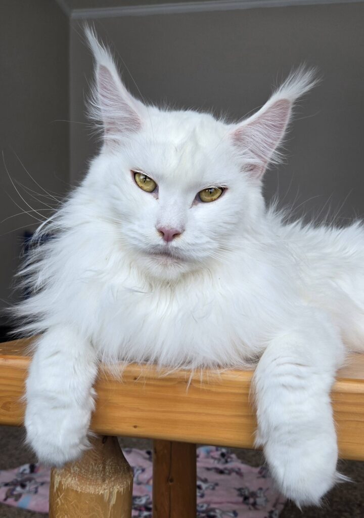 Wynter is a home bred, beautiful solid white, out of Zoey and Tyson.  She loves her hammock more than any cat tree.  She also loves watching the birds from her window.